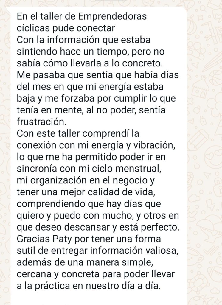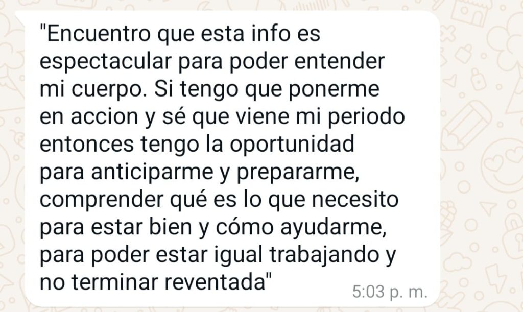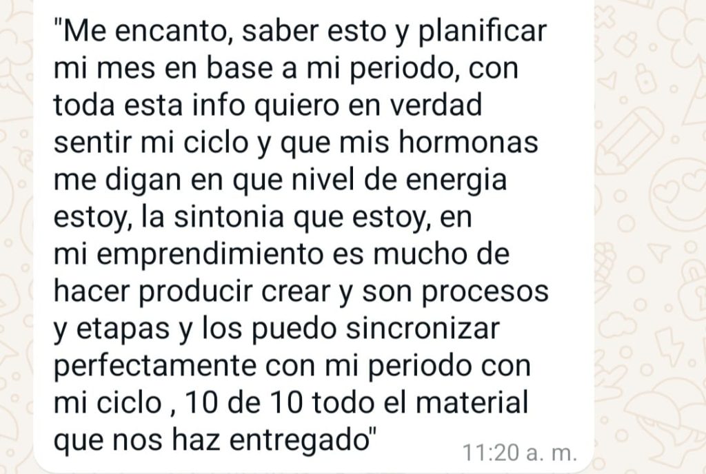 Aprendí que emprendimiento es mucho de hacer producir crear y son procesos y etapas. Ahora los puedo sincronizar perfectamente con mi periodo con mi ciclo.
