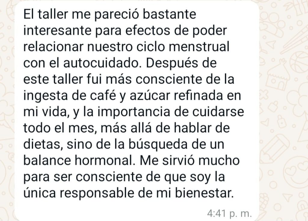 Comprendí la conexión entre mi energía y mi ciclo menstrual, lo que me permitió organizar mejor mi negocio y mejorar mi calidad de vida. Hoy sé que hay días donde puedo con todo y otros donde solo quiero descansar, y está perfecto permitirme eso sin culpa.