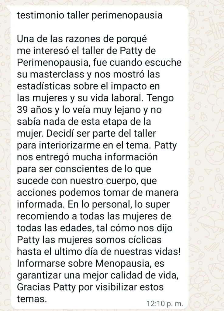 Me encanto el taller Cyclic Boss, Paty se dio el tiempo de explicar en detalle todo lo que ocurre con nuestro ciclo, gracias al taller pude identificar perfectamente porque me siento con mas energía en algunos días y otros no, y lo que más destaco y que he podido utilizar como gran herramienta de trabajo es que gracias a la identificación de casa fase del ciclo puedo organizar mi agenda en base a los días en que me siento mas entusiasta que otros.